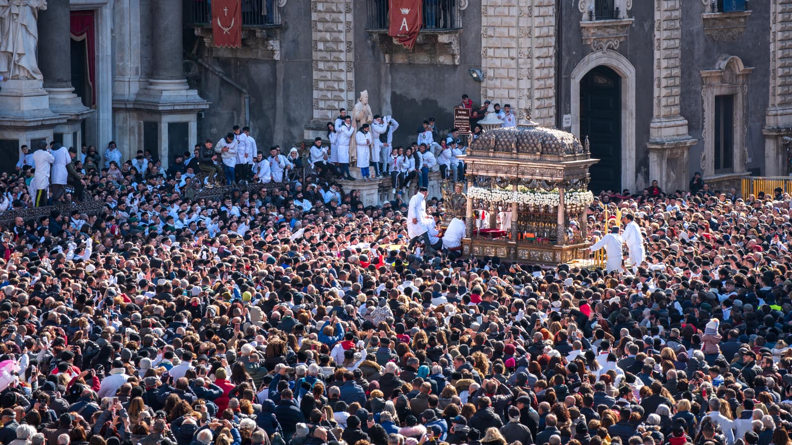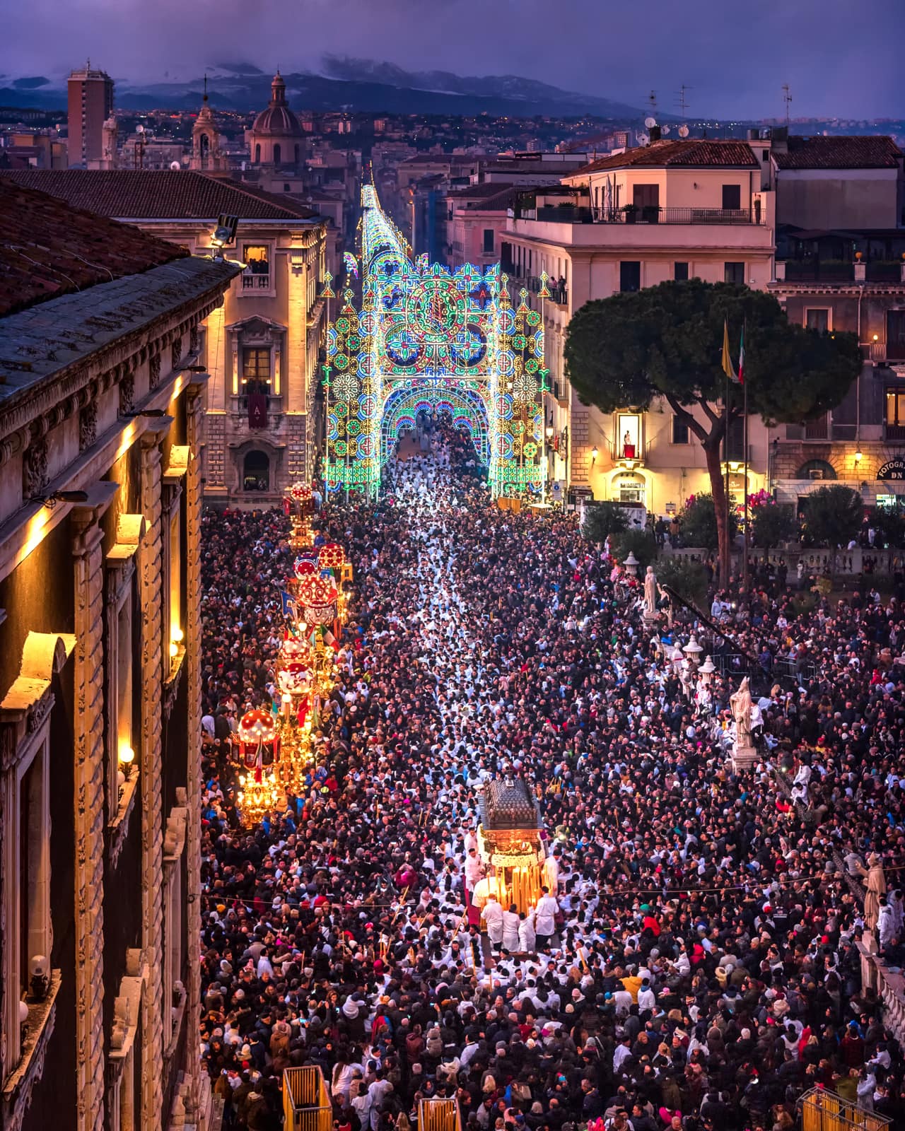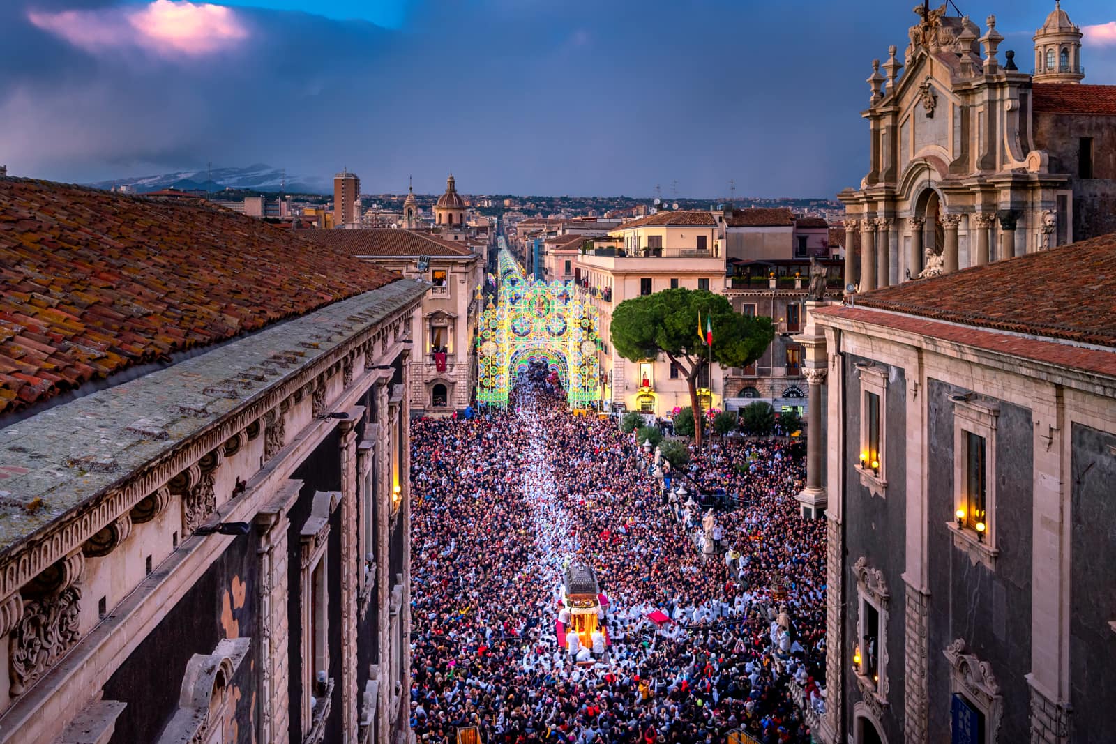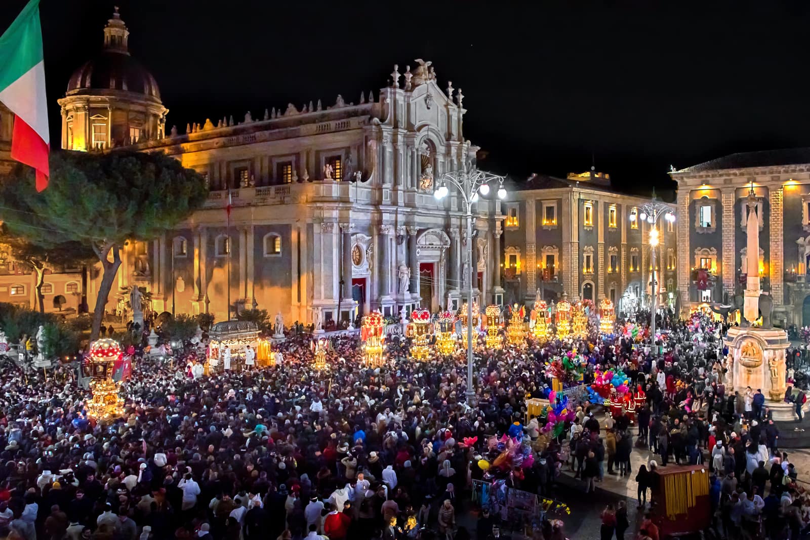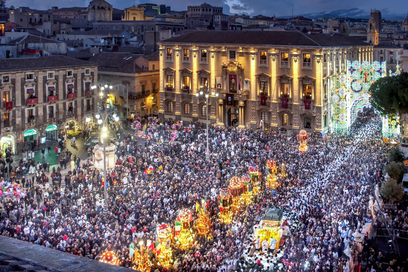 Ogni anno il 3, il 4 e il 5 febbraio Catania offre alla sua patrona una festa così straordinaria che può essere paragonata soltanto alla Settimana santa di Siviglia o al Corpus Domini di Cuzco, in Perù. In quei tre giorni la città dimentica ogni cosa per concentrarsi sulla festa, misto di devozione e di folklore, che attira ogni anno sino a un milione di persone, tra devoti e curiosi. Il primo giorno è riservato all’offerta delle candele. Una suggestiva usanza popolare vuole che i ceri donati siano alti o pesanti quanto la persona che chiede la protezione. Alla processione per la raccolta della cera, un breve giro dalla fornace alla cattedrale, partecipano le maggiori autorità religiose, civili e militari. Due carrozze settecentesche, che un tempo appartenevano al senato che governava la città, e undici “ candelore ”, grossi ceri rappresentativi delle corporazioni o dei mestieri, vengono portate in corteo. Questa prima giornata di festa si conclude in serata cori un grandioso spettacolo di giochi pirotecnici in piazza Duomo. I fuochi artificiali durante la festa di sant’Agata, oltre a esprimere la grande gioia dei fedeli, assumono un significato particolare, perché ricordano che la patrona, martirizzata sulla brace, vigila sempre sul fuoco dell’Etna e di tutti gli incendi.