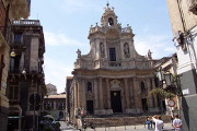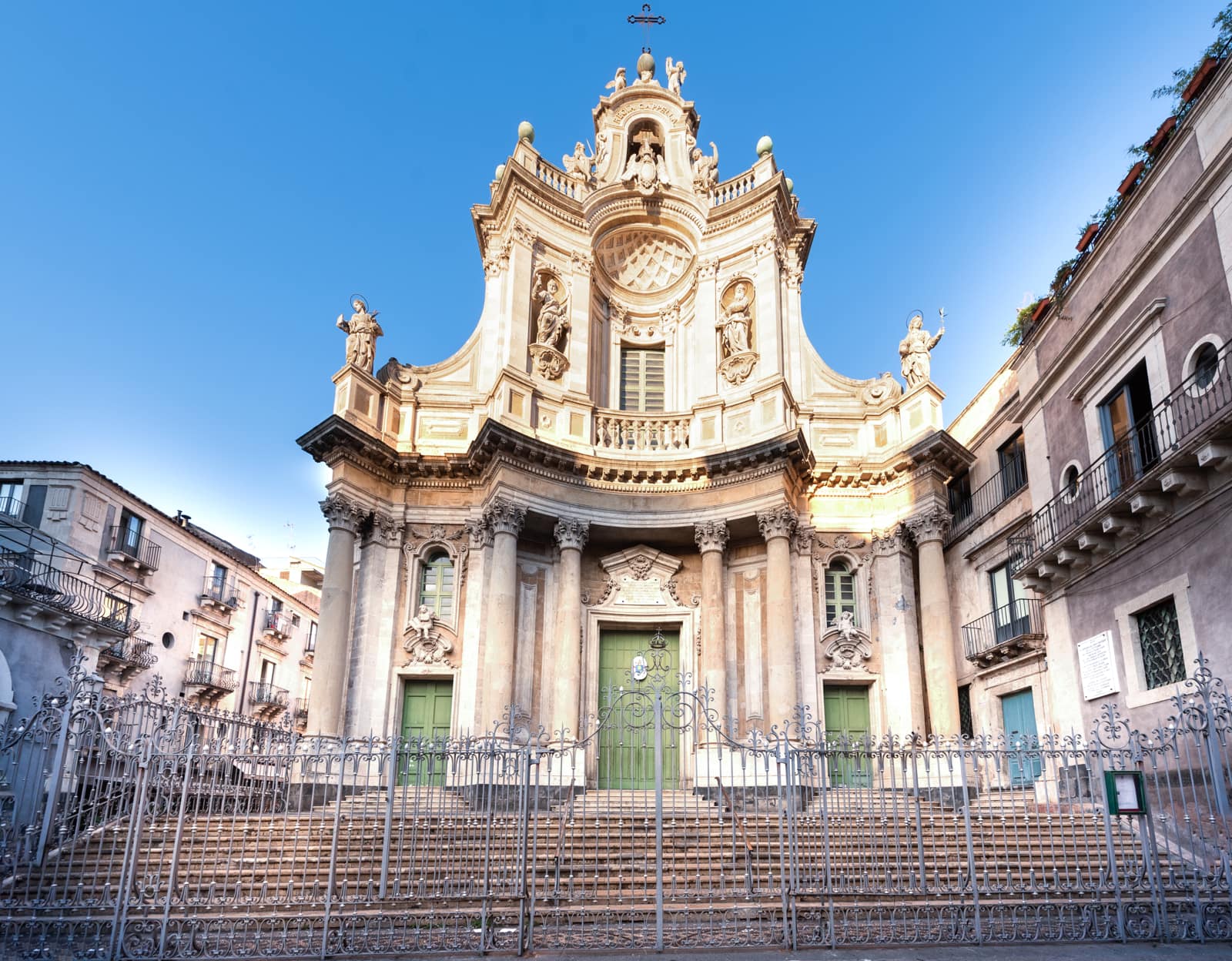 Dopo il terremoto del 1693 venne ricostruita nello stesso luogo dell’antica chiesa ma rovesciata, con la facciata disposta lungo la via Etnea. Questa nuova collocazione consentiva alla chiesa di affacciarsi sulla via più larga e importante della Catania risorta dalle distruzioni. L’edificazione della chiesa settecentesca si deve all’architetto Antonio Amato su progetto del gesuita Angelo Italia. La facciata, opera straordinaria di Stefano Ittar (1758), è mossa da tutta una serie di concavità e convessità che conferiscono all’insieme musicalità ed armonia.