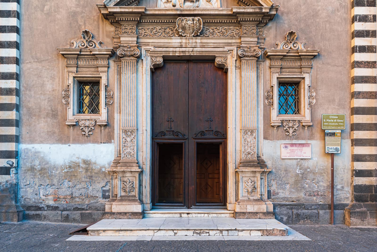 In Piazza Santa Maria di Gesù, quasi nascosta alla vista, si trova la chiesetta con il prospetto del 1706 attribuito a Girolamo Palazzotto. Accanto è la cinquecentesca cappella dei Paternò con l’esterno decorato a fasce bicrome. Nell’edificio si entra da uno splendido portale, scolpito nel 1519 da Antonello Gagini, sormontato da una lunetta con la Vergine Maria e il bambino. La chiesa, proprietà della famiglia Paternò di Carcaci, fu eretta nel Quattrocento, in parte rimaneggiata da Antonello Gagini nel 1518 e ricostruita dopo il terremoto del 1693. Allo stato attuale il piccolo edificio sacro è come fagocitato dagli enormi palazzi moderni che si estendono tutt’intorno alla piazza dominata dalla chioma grandiosa di un Ficus centenario. Particolarmente stridente appare il confronto tra la preziosità delle ville in stile fiorito, che adornano il viale Regina Margherita, e l’essenzialità architettonica della facciata della piccola chiesa. Nel clima post-unitario, che vide l’acquisizione e, a volte, lo smembramento degli edifici sacri, la chiesa e l’annesso monastero, vennero usati, prima come sede di un Ospizio di Mendicità e, poi, furono accorpati all’edificio dell’Istituto scolastico Archimede (che si affaccia sul viale Regina Margherita) al quale il chiostro settecentesco fornì il locale per le officine meccaniche.