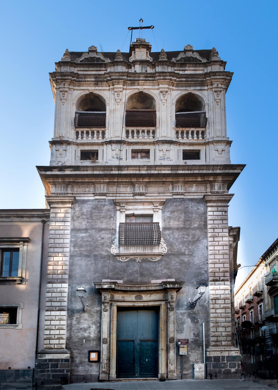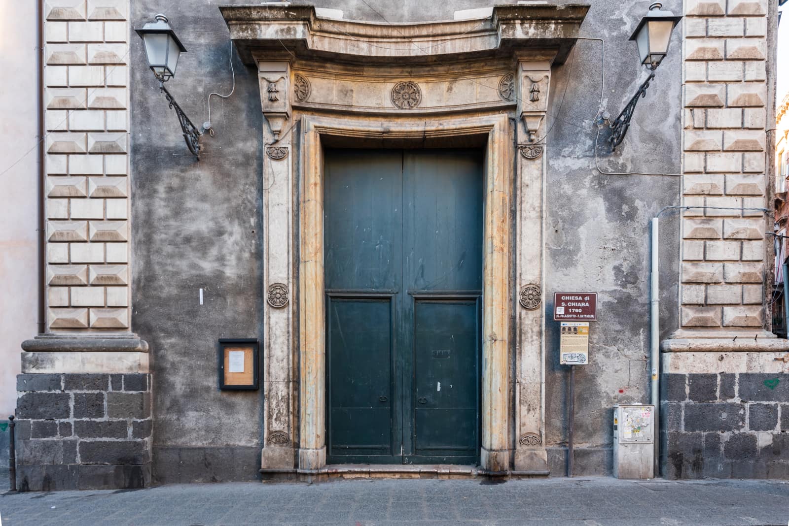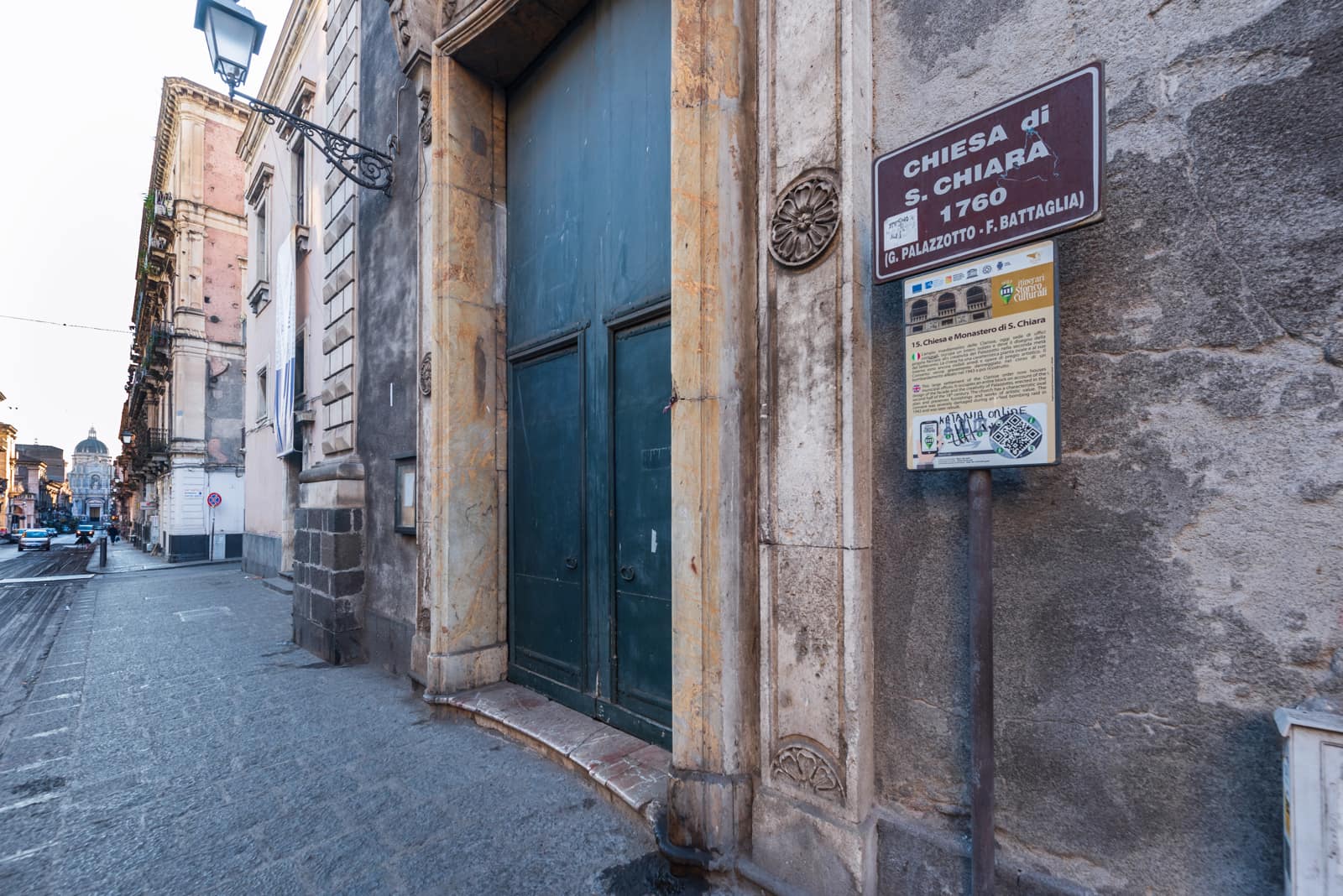 La Chiesa e il Monastero di S. Chiara occupano un intero isolato; il lato più corto è interamente impegnato dalla chiesa che prospetta sulla importante via Garibaldi (un tempo via S. Filippo) dalla quale passava la processione di S. Agata. Il controllo della visuale della processione ha, spesso, condizionato la scelta di soluzioni particolari all’interno di uno stesso schema tipologico; esempi di queste soluzioni sono le due logge belvedere costruite sulle cupole della chiesa di S. Giuliano (in via Crociferi) e in quella di S. Chiara. Da questa loggia era possibile seguire tutto il percorso della santa dal Duomo, in avanti, lungo la via Garibaldi. Il monastero, oggi sede di uffici comunali, è stato costruito nell’area dell’isolato retrostante al coro della chiesa. Il disegno della facciata della chiesa è di S. Palazzotto(metà del Settecento). All’interno, preceduto da una breve gradinata, si può vedere un pannello in legno con raffigurazioni di scene della Bibbia. Sopra l’ingresso è una splendida cantoria dorata con l’immagine di S. Chiara. Gli altari sono cinque: quello dell’Immacolata, quello di S. Lorenzo, l’altare maggiore, riccamente decorato sul quale poggiano le statue di S. Chiara e S. Francesco, l’altare di S. Chiara e quello del SS. Crocefisso con un prezioso reliquiario. Al centro della volta è un grande affresco che rappresenta Il Trionfo delle Clarisse. E un’opera del 1766 dell’artista Olivio Sozzi. Tra le cose più preziose della chiesa è il bellissimo pavimento di marmi policromi.