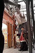 - Sistema di manovra: dall’alto di un ponte posto dietro i fondali (‘u scannappoggiu): gli animatori sorreggono i pupi poggiando i piedi su una spessa tavola di legno sospesa a circa un metro da terra (‘a faddacca).